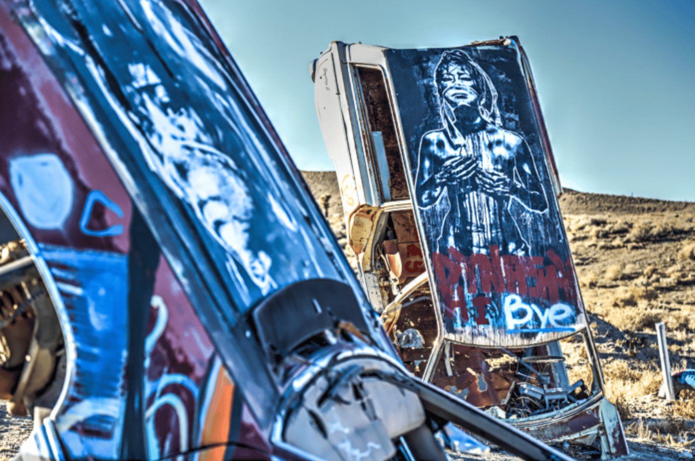 The scale and silence of the Car Forest grabs your attention. In the middle of the desert, you’ll find a 10-ton school bus standing vertically, its yellow paint peeling under murals of skulls, political caricatures, and celestial beings. Because there are no fences, no tickets, and no gift shops, the experience is both lonely and really personal. You are free to climb through the wreckage, walk under a leaning limo, or witness the desert wind whistle through shattered windshields.